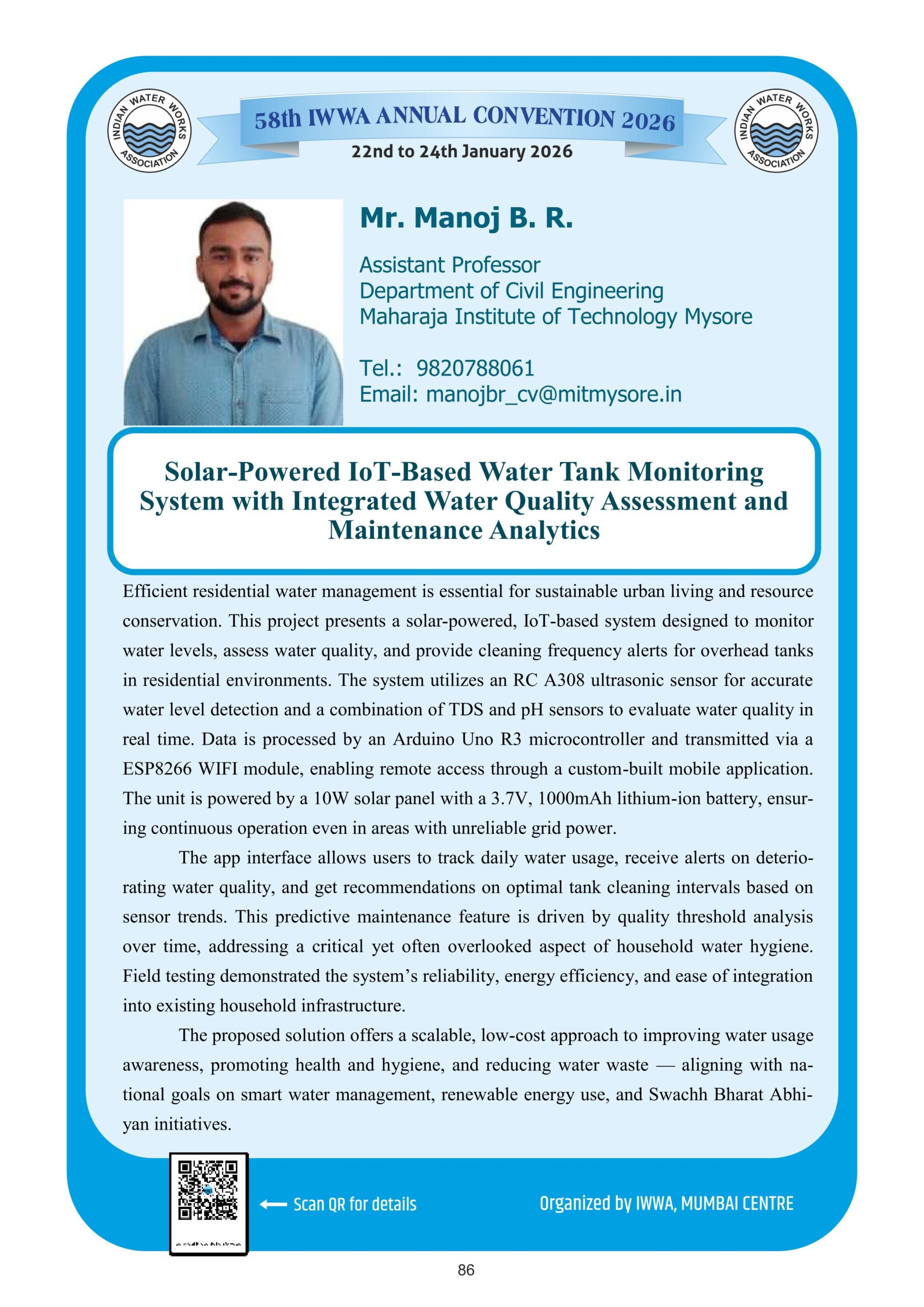 34. Solar-Powered IoT-Based Water Tank Monitoring System with Integrated Water Quality Assessment and Maintenance Analytics
