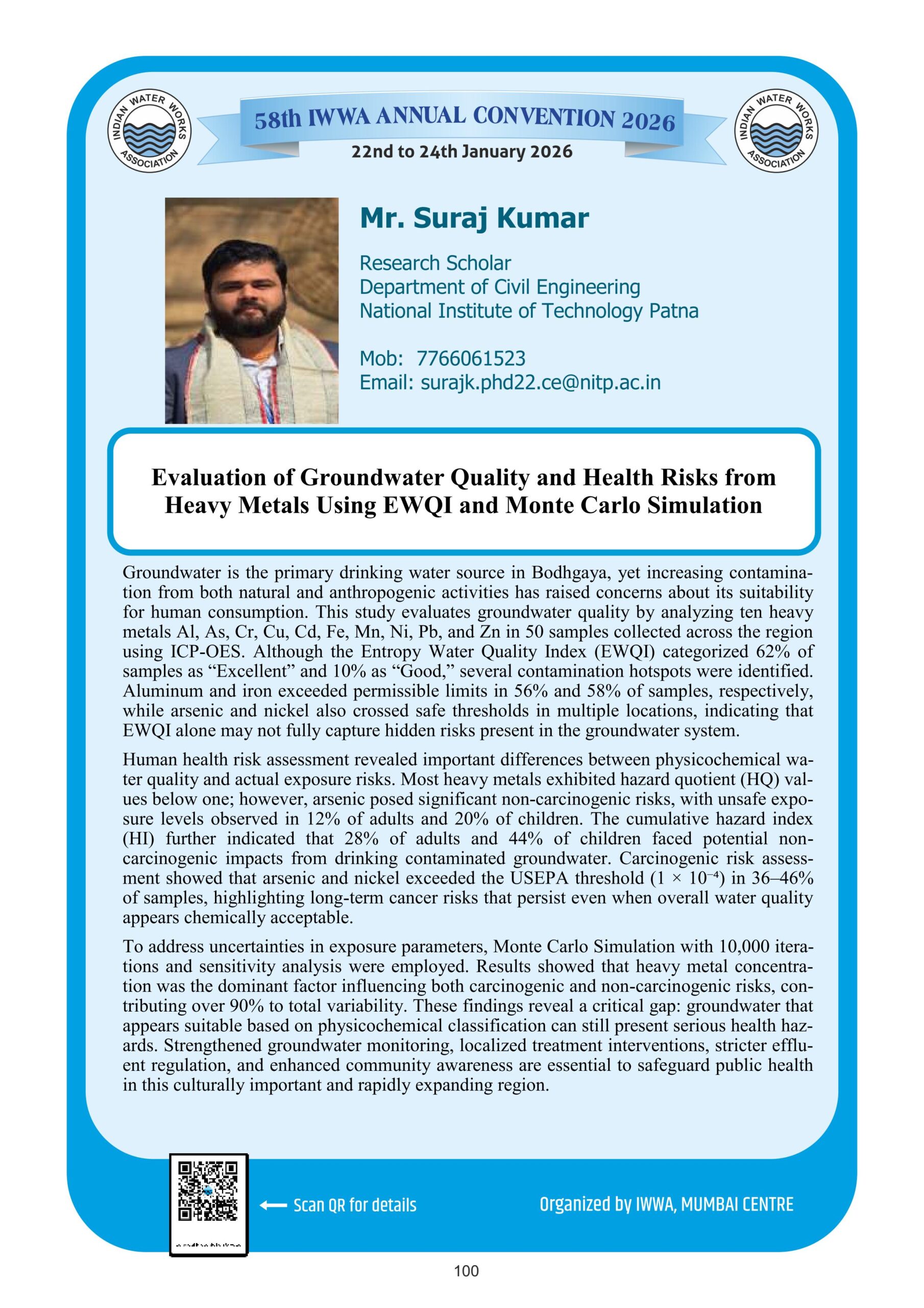 48. Evaluation of Groundwater Quality and Health Risks from Heavy Metals Using EWQI and Monte Carlo Simulation